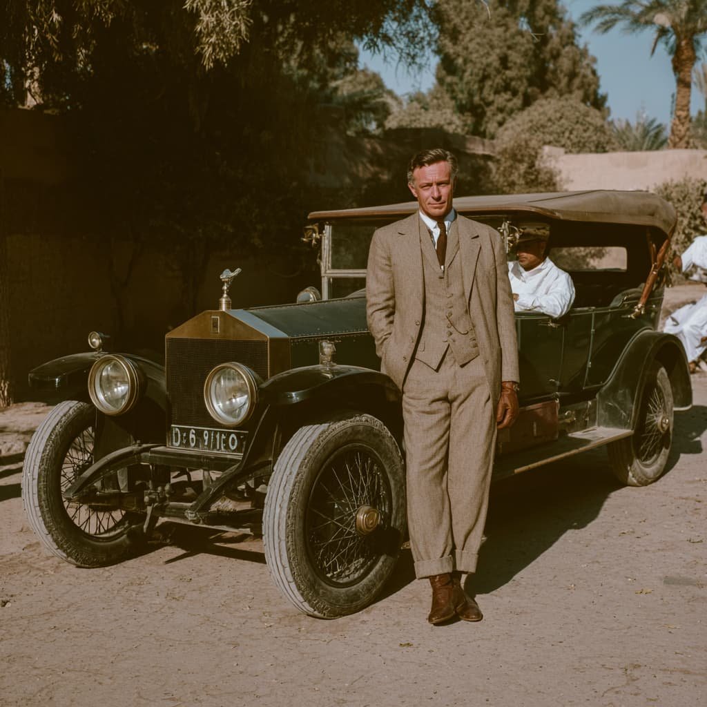 Just dropped a new photo study, imagining a 1920s aristocrat on an unexpected road trip through the desert. Love the texture and the old-school cool of the bespoke tweed suit against that huge vintage car. It’s giving me total Lawrence of Arabia vibes.